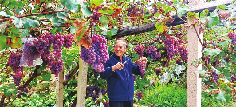 在种植户赵文元的葡萄园里,66岁的老赵正忙得不亦乐乎。他侍弄龙眼葡萄已有20多个年头,对这些“老伙计”的脾性了如指掌。“你瞧这龙眼,颗颗像算盘珠子,现在每公斤能卖到8元。”他托起一串沉甸甸的果实,紫黑色的果粒上覆着均匀的白霜,自豪地说,“但别急,最好的味道在国庆后,霜降一打,糖分攒足了,那才叫一个甜哩!”