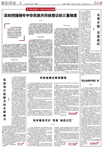 党的二十届三中全会指出,要健全铸牢中华民族共同体意识制度机制,增强中华民族凝聚力。中华民族共同体意识是国家统一之基、民族团结之本、精神力量之魂。习近平总书记在全国民族团结进步表彰大会上强调,“党的十八大以来,我们坚持守正创新,不断推进马克思主义民族理论中国化时代化,鲜明提出把铸牢中华民族共同体意识作为新时代党的民族工作主线、民族地区各项工作的主线,形成党关于加强和改进民族工作的重要思想”。因此,要牢牢把握新时代党的民族工作的主线,从政治、经济和文化三重维度铸牢中华民族共同体意识,牢牢把握大团结大联合主题、完善大统战工作格局,团结凝聚各族各界群众,保持民族团结进步的良好局面。