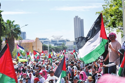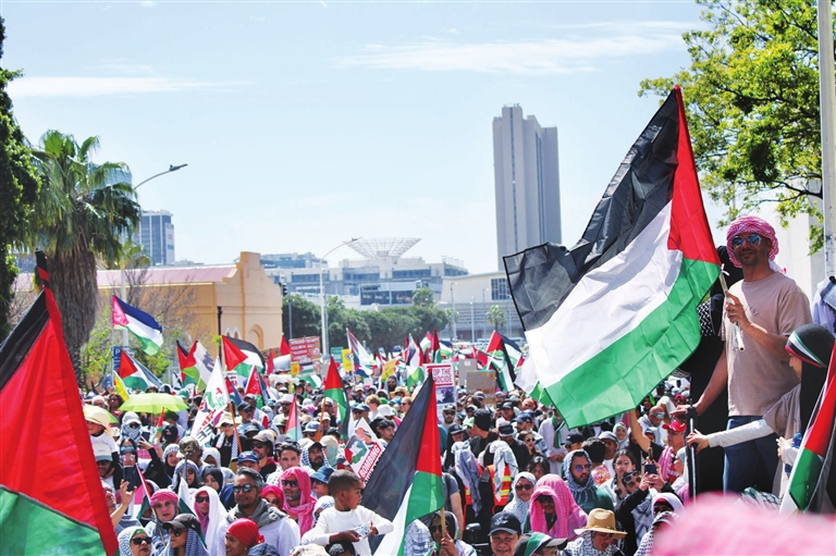 当日,南非立法首都开普敦数千名民众举行大规模游行声援巴勒斯坦,抗议以色列在加沙地带的军事行动。新华社发 (沙姬拉·泰比 摄)