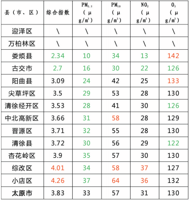 1.综合指数、PM10、NO2和O3指标排名前两位的标为绿色,排名后两位的标为红色;