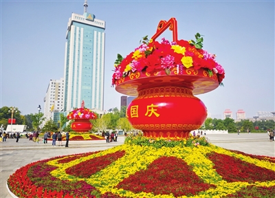 在北广场,主题立体花坛处有一对两侧各写有“欢度国庆”“祝福祖国”字样的喜庆花篮,篮内搭配各色花卉,呈现出欣欣向荣的美好景象。
