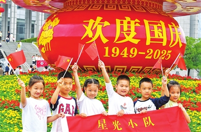 10月1日,小朋友在安徽省合肥市蜀山区市民广场国庆主题花篮前拍照。当日是国庆节,各地群众以不同形式共庆祖国华诞。新华社发 (陈三虎 摄)