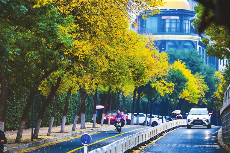 十月五日,我市秋雨绵绵,滨河东路旁,沾满秋意的黄叶展现出一种独特的韵味。米国伟 摄