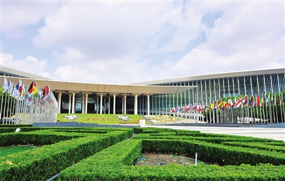 从空中俯瞰,进博会举办场所国家会展中心(上海)的外形如同一棵“四叶草”,静待着八方宾客。