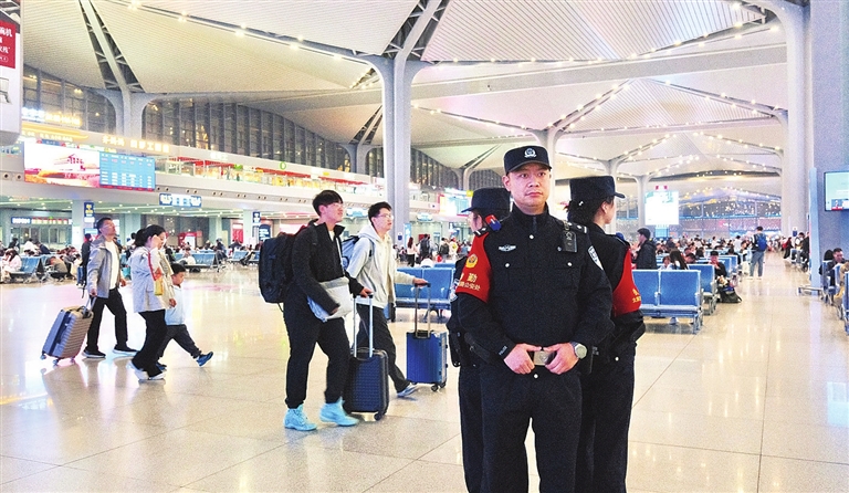 10月7日,国庆假期第7天,太原南站迎来了返程高峰,太原铁路公安处太原南站派出所增派警力,配合车站客运部门,确保广大旅客安全返程。王韵菲 摄