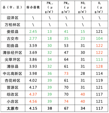 1.综合指数、PM10、NO2和O3指标排名前两位的标为绿色,排名后两位的标为红色;