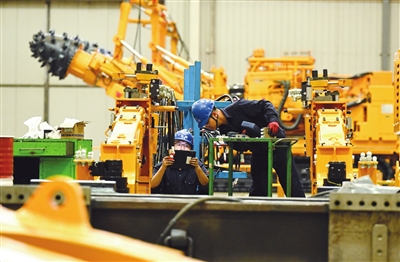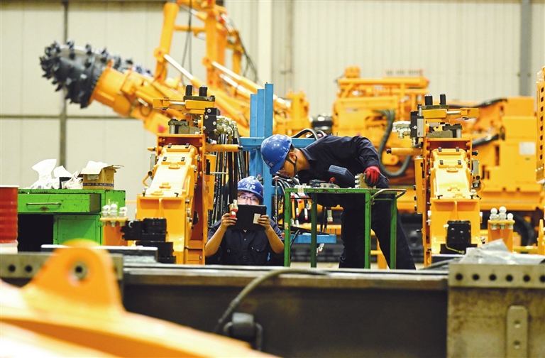 10月9日,在河北石家庄装备制造产业园,技术人员在石家庄煤矿机械有限公司装配车间组装装备。国庆、中秋“双节”假期结束,各地企业开足马力,生产一线一派热火朝天的景象。新华社发(陈其保 摄)
