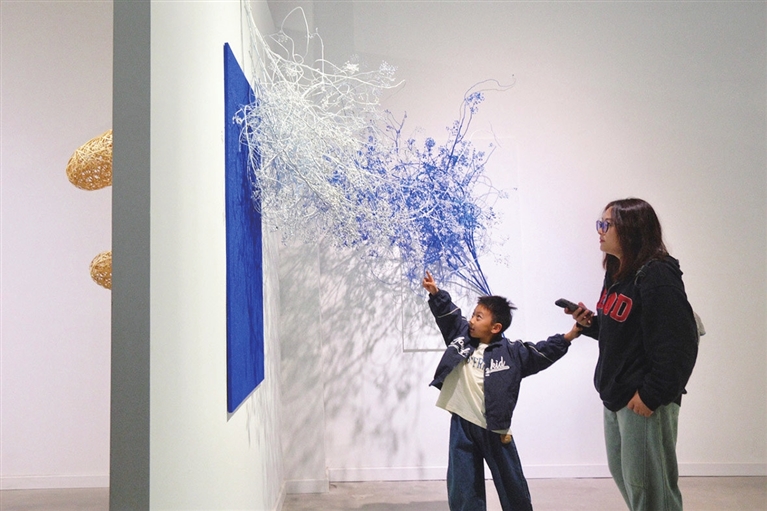 10月12日,观众在位于杏花岭区“在”美术馆欣赏“触不可及”草月流现代艺术展。艺术家们运用枯枝、花叶、光影等,将自然美学与当代装置艺术语言相结合,为观众营造出一片艺术场域。王韵菲 摄