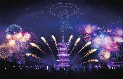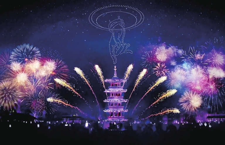 夜幕降临,江苏无锡拈花湾景区内,一座高约25米的AI塔被点亮,1500架无人机腾空而起。光影与水雾交织,夜空化身“奇幻剧场”,游客纷纷举起手机,惊叹声此起彼伏:“这简直像在看科幻大片!”