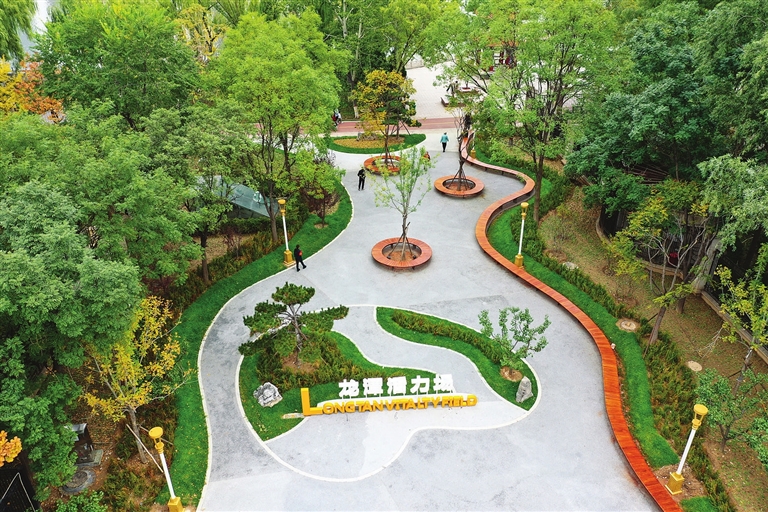 除配套绿化外,市园林局还对龙潭公园、西海子公园等进行了“微改造”,将之与道路和新建的游园、绿地深度融合。一是改造龙潭公园西侧绿地,将之与街道功能区共计6个地块连接,打造城区的生态呼吸带、文化展示窗与社区会客厅。同时,栽植白皮松、油松、国槐、白蜡、金叶复叶槭等乔木,杏树、重瓣榆叶梅、西府海棠等花灌木,安装不锈钢围树坐凳、娱乐健身器材,提升广大市民游园体验;二是破除饮马河公园西侧原有铺装,面积约2.4万平方米,通过“拆墙透绿”的手法,实现公园景观与城市环境的无缝衔接,打造兼具生态功能、休闲价值与城市活力的开放式绿化空间;三是在西海子公园安装围树坐凳、圆弧坐凳、不锈钢秋千、智能设施、荷叶廊架,铺装环河道等,搭配大规格的国槐、白蜡、银杏、五角枫、柳树等乔木,构建层次丰富、生态稳定的植物群落,让市民在街道、社区中即可直观感受公园的自然绿意,实现“城市即公园,公园即生活”的共享场景。