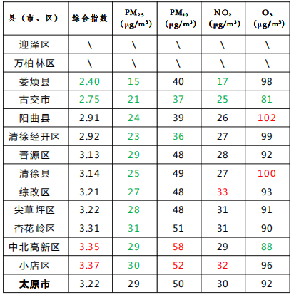 1.综合指数、PM10、NO2和O3指标排名前两位的标为绿色,排名后两位的标为红色;