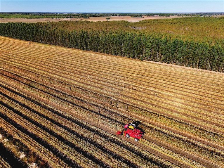 10月18日,在通辽市科尔沁左翼后旗吉尔嘎朗镇,农机手驾驶收割机收割玉米(无人机照片)。