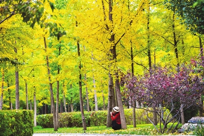 10月22日,迎泽公园内游客在秋色中拍照赏景。我市各大公园、景区到处五彩斑斓、秋色怡人,成为市民出门赏秋的好去处。牛利敏 摄