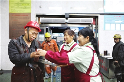 10月22日,山西焦煤西山煤电官地矿组织女工协管员为下井职工准备“小吊梨汤”,让一线职工在寒冷的天气里感受温暖。王韵菲 白 锐 摄影报道