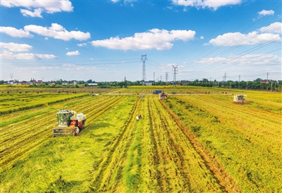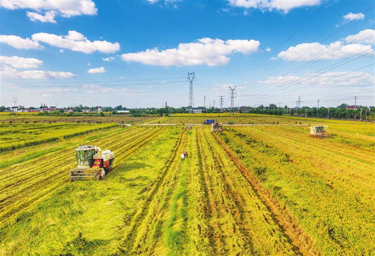 10月22日,在江苏省扬州市江都区邵伯镇孙桥村,农民在收割水稻(无人机照片)。