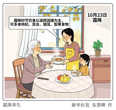 “霜降养生核心在于防寒以护阳,润燥以养阴,顺时以养‘收’。”宁夏医科大学中医学院教授郭斌说,霜降后应进一步调整作息,早卧晚起,使阳气得以潜藏,阴精充足,符合“秋冬养阴”原则。同时饮食以滋阴润燥为主,可多食枸杞、百合、银耳、梨等食物。