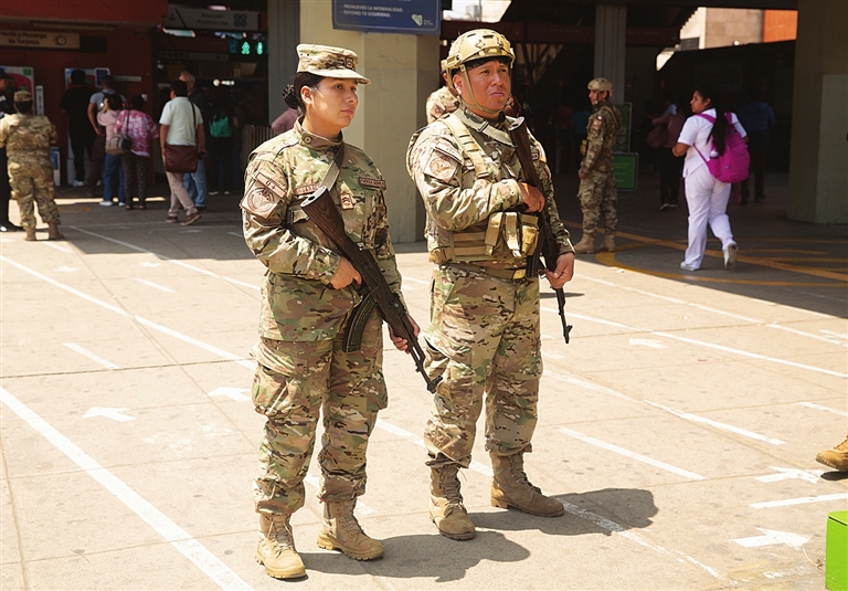 10月22日,在秘鲁首都利马,军人正在巡逻。 秘鲁总统何塞·耶里21日晚宣布,秘鲁首都利马等地进入为期30天的紧急状态,自22日零时起正式生效。该措施旨在规划、实施并执行联合行动,以坚决应对当前影响全国的犯罪浪潮。新华社发