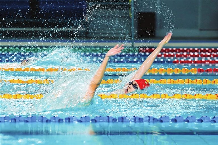 10月31日,太原市第十三届运动会青少年游泳比赛在山西体育中心游泳馆举办,来自全市的857名游泳小将展开激烈角逐。图为男子初中组100米仰泳比赛现场。王韵菲 摄