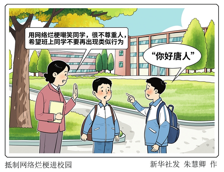 前不久,重庆一名初中老师在社交平台上发布抵制网络烂梗进校园的视频,引发广泛关注。这位教师在视频中称,班上有学生用“唐人”“你好唐人”等网络烂梗嘲笑同学,这种行为实在不妥,很不尊重人,希望班上同学不要再出现类似行为。