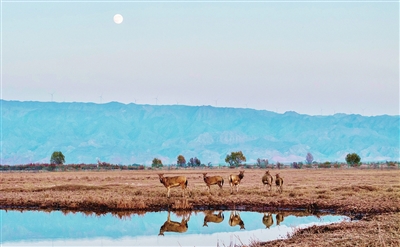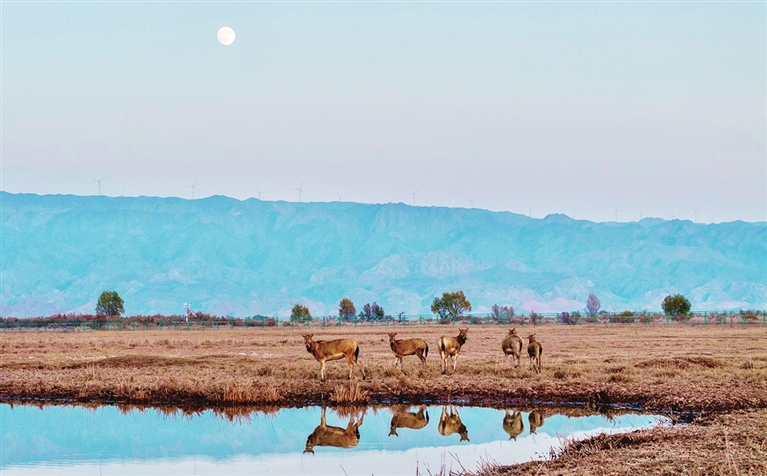 这是11月4日在宁夏青铜峡库区湿地自然保护区内拍摄的麋鹿(无人机照片)。新华社记者 杨植森 摄