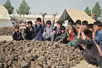 10月28日,在阿富汗霍斯特省的松子加工交易市场,当地儿童帮忙采集松子。新华社发