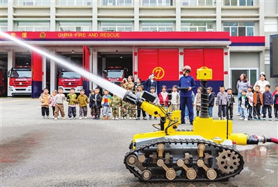 11月7日,在贵州省黔西市消防救援大队,消防员给小朋友演示灭火机器人。全国消防日之际,各地开展丰富多彩的消防宣传教育活动,以提高人们的消防安全意识和自防自救能力。新华社发 (范 晖 摄)