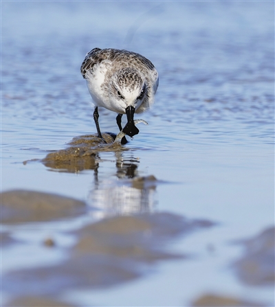 11月9日,一只勺嘴鹬在泉州围头湾滩涂上捕食海虾。