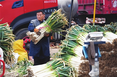 11月10日,太原市河西农副产品市场内,菜商正在卸车。目前,白菜、土豆、大葱等冬储菜大量上市,价格平稳,市民“菜篮子”供应充足。邓寅明 摄