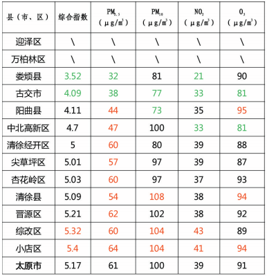 1.综合指数、PM10、NO2和O3指标排名前两位的标为绿色,排名后两位的标为红色;