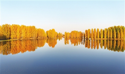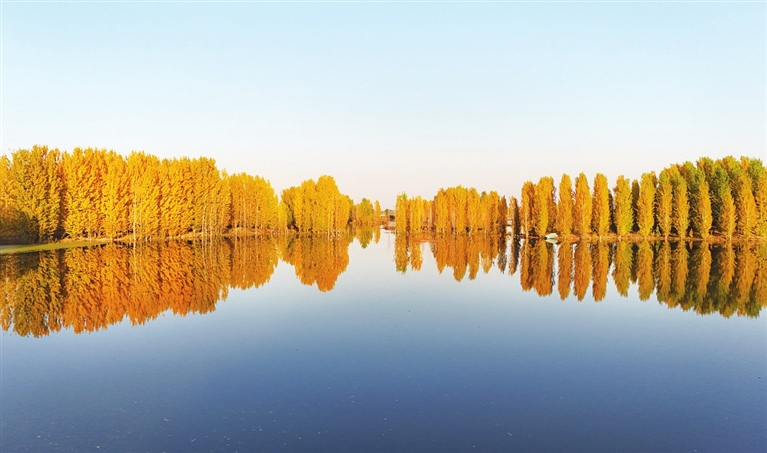 初冬时节,在河北省邢台市隆尧县亦城村泜河沿岸,树叶金黄,与水面、河岸相映衬,勾勒出一幅美丽和谐的自然画卷。