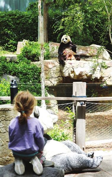 11月10日,一名小女孩在澳大利亚阿德莱德动物园观看大熊猫。 雄性大熊猫“星秋”和雌性大熊猫“怡兰”2024年12月15日搭乘专机抵达阿德莱德,开启新一轮中澳大熊猫保护合作研究。按协议约定,它们将在澳大利亚生活10年。 新华社记者 马 平 摄