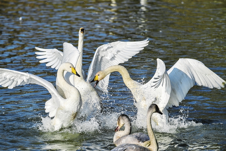 11月13日,白天鹅在山西平陆黄河湿地嬉戏。初冬时节,山西平陆黄河湿地迎来了从俄罗斯西伯利亚地区飞来越冬的白天鹅。占地6000多公顷的山西平陆黄河湿地位于山西、河南两省交界处,每年到此越冬的白天鹅数量在1万只左右。新华社记者 曹 阳 摄