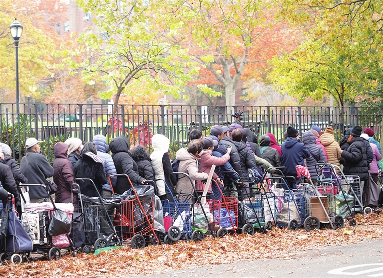 11月12日,在美国纽约皇后区纽约食物银行一处发放点,人们排起长队,在寒风中等待领取食品和日用品。新华社发