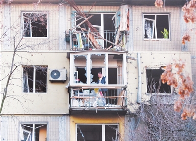 11月14日,在乌克兰首都基辅市第聂伯区,当地居民对遭受空袭损毁的房屋进行清理。当天凌晨,基辅遭到俄军大规模空袭。新华社记者 李东旭 摄