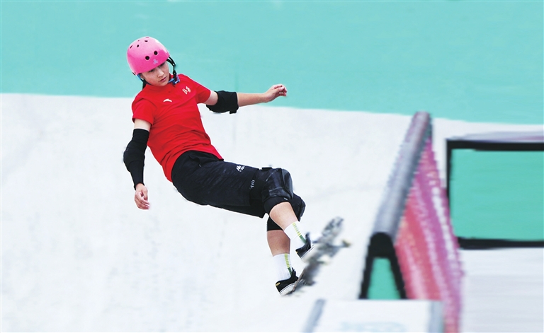 ①滑板女子碗池决赛中的14岁小将韩岫芊澄