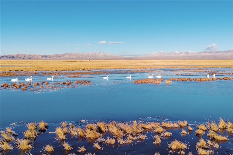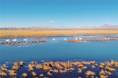 作为甘肃省最大的内陆湖泊系统,大、小苏干湖于1982年被划定为省级候鸟自然保护区。新华社记者 郎兵兵 摄