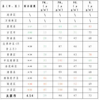 1.综合指数、PM10、NO2和O3指标排名前两位的标为绿色,排名后两位的标为红色;