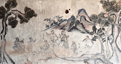 该壁画的艺术价值亦不容小觑。它摒弃了传统水陆画的浓艳设色,以水墨为主融入山水意境。远山淡染、松枝遒劲的背景下,神鬼对峙的画面既具有宗教仪式感,又不失文人画的雅致。这种将道教题材与中国画技法结合的尝试,在明清民间庙宇壁画中颇为罕见。此外,壁画对疫鬼形象的细致刻画——秃顶、草裙、捆绑跪地等细节,直观反映了古人对瘟疫的具象化想象,“降服”而非“诛杀”的主题,或许也寄托了民间以非暴力化解灾疫的愿望。