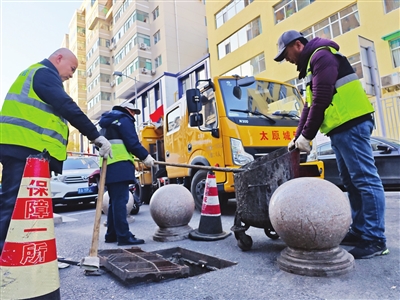 11月20日,市政建管中心道排保障一所工作人员在羊市街进行落叶清掏工作,确保冬日地下管网畅通。牛利敏 杨 斌 摄影报道