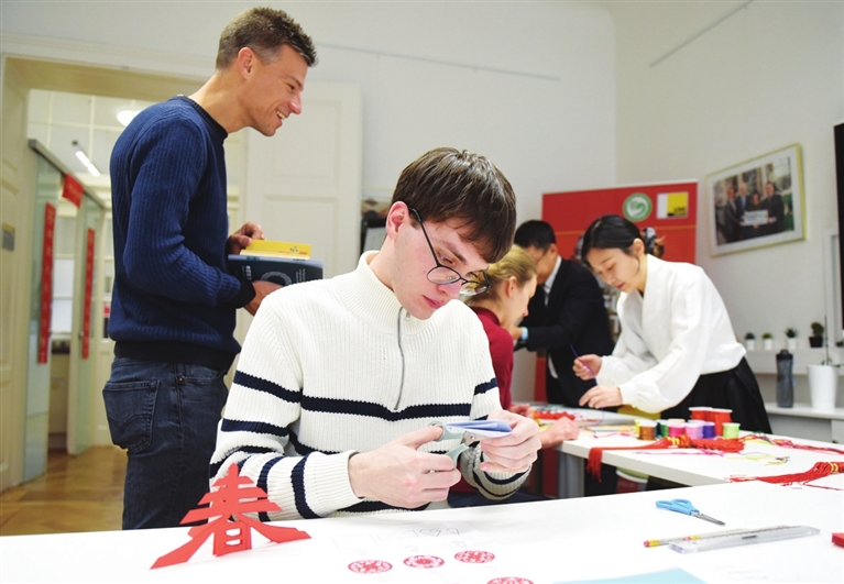 11月21日,人们在奥地利格拉茨大学孔子学院体验剪纸和制作中国结。近日,奥地利格拉茨大学孔子学院成立15周年庆祝活动在格拉茨举行。新华社记者 贺灿铃 摄