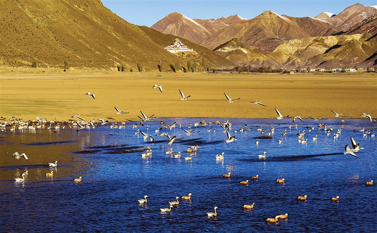 这是11月23日在西藏拉萨市林周县拍摄的越冬候鸟(无人机照片)。冬日时节,拉萨市林周县迎来大批越冬候鸟,黑颈鹤、斑头雁、赤麻鸭等候鸟在河谷、湖泊等地觅食、休憩。新华社发