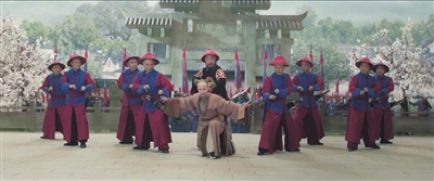 片中于成龙上山劝降一段,十分出彩。于成龙顶着炎炎烈日,携一仆一吏,踏上充满挑战的旅程。在崇山峻岭的大场景设计下,导演巧设一片空地作为三人展现戏曲技艺的舞台。三人打凉伞、鸣铜锣、骑跛骡、摇葵扇等一系列程式动作都在此片空台上肆意挥洒展开。既保留了戏曲表演中的虚拟性特征,如骑跛骡的演绎不依赖真实动物,而是通过演员的唱念做打呈现;又借助导演巧妙的镜头运用,营造出一种既真实又超脱的氛围。镜头流畅切换,既有宏大叙述,也有细腻抒写,大大增强了画面的层次感。
