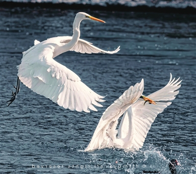 那真是一种令人屏息的洁净。它们的羽毛,不是那种呆板的、毫无生气的白,而是一种透着光泽的、温润的乳白,尤其是在逆光下,羽毛的边缘仿佛被镀上了一层极细的、明亮的金边,有了玉的质感。它们的身形是那样颀长而优雅,长颈曲成一个从容的问号,铁色的长喙像一柄出鞘的利剑,却又凝然不动。最是那双青黑色的长腿,立在清浅的寒水中,瘦硬如竹枝,自有一种遗世独立的清高。它们有的静静伫立,与脚下冰冷的河水、与这整个冬天都融为了一体;有的则缓步徜徉,步子迈得极轻、极慢,像芭蕾舞者用足尖在试探大地;偶尔,会有一只忽地引颈一啄,快如闪电,水面便漾开一圈小小的涟漪,那便是它今日的餐食了。