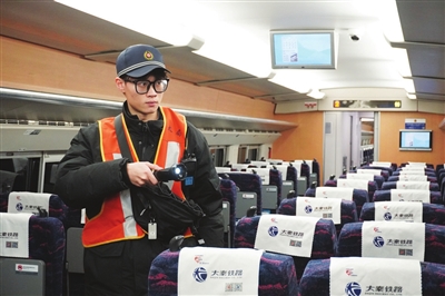随着气温持续走低,太原车辆段太原动车所开启动车组“打温”作业,动车组机械师通过调节车内空调温度,确保车厢温度夜间维持在18℃以上,保障次日动车组能够安全准点投入运营。图为11月25日晚,工作人员在车厢内巡视检查。