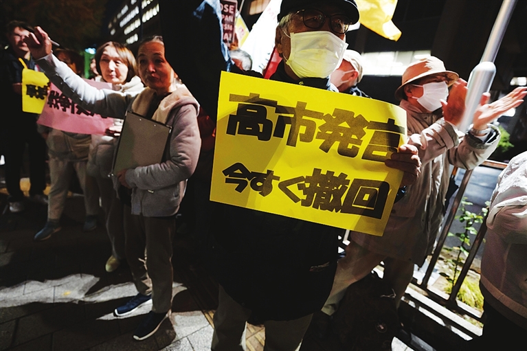 抗议者大内真纪子对记者说,她认为高市涉台错误言论造成日中关系恶化,“日本旅游业已经受到巨大冲击,社会氛围也明显变得更紧张”。