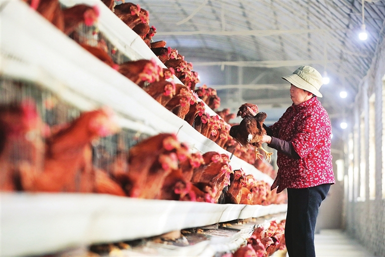 11月27日,阳曲县载宏养殖专业合作社内,农户在观察鸡群状态。该合作社通过精细化、科学化的现代养殖技术,提高了蛋鸡产蛋率和经济效益,实现稳定增收,助力乡村振兴。王韵菲 摄