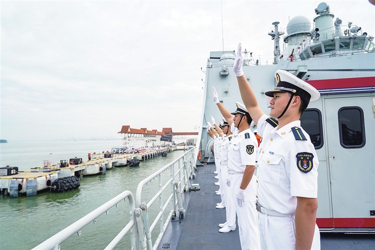 当地时间10时许,中国海军长白山舰、郑和舰和“向前进1号”船缓缓驶入巴生港码头。中国驻马来西亚大使馆工作人员、留学生代表、华侨华人代表以及马来西亚皇家海军官兵等200余人到码头迎接。来自海军工程大学和海军航空大学的学员在甲板分区列队,向欢迎人群致意。