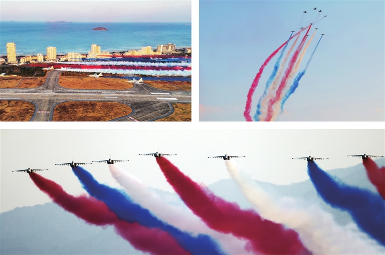 这张朝中社提供的拼版照片显示的是朝鲜空军飞机进行飞行表演。新华社/朝中社