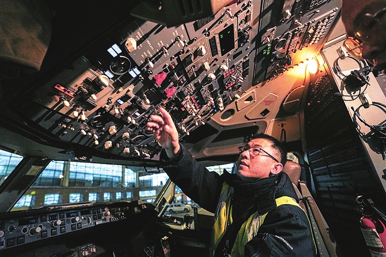 为应对寒冷天气,东航技术山西分公司机务维修员加强除防冰和飞机系统排查,制定针对性保障措施,为飞行安全保驾护航。12月4日,维修员在检查驾驶舱指示灯。王韵菲 贺少博 摄影报道