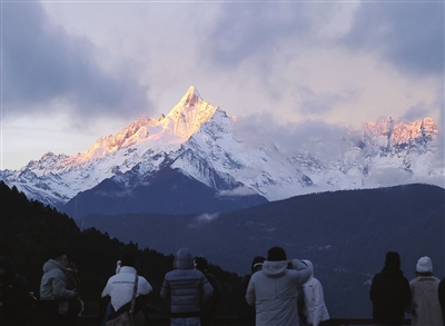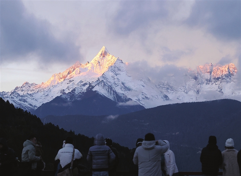 12月3日清晨,云南梅里雪山在云海中若隐若现,在阳光照射下呈现出“日照金山”的壮丽景观。新华社发